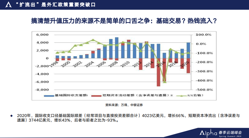 从这个意义上来讲,2013年以前外汇储备的增加主要是来自于基础交易的顺差太大,而短期资本流入并不是太多,它的问题在于没有流出。我们长期以来由于宽进严出的管理,影响了我们应对流入压力,应对升值压力的政策效果。