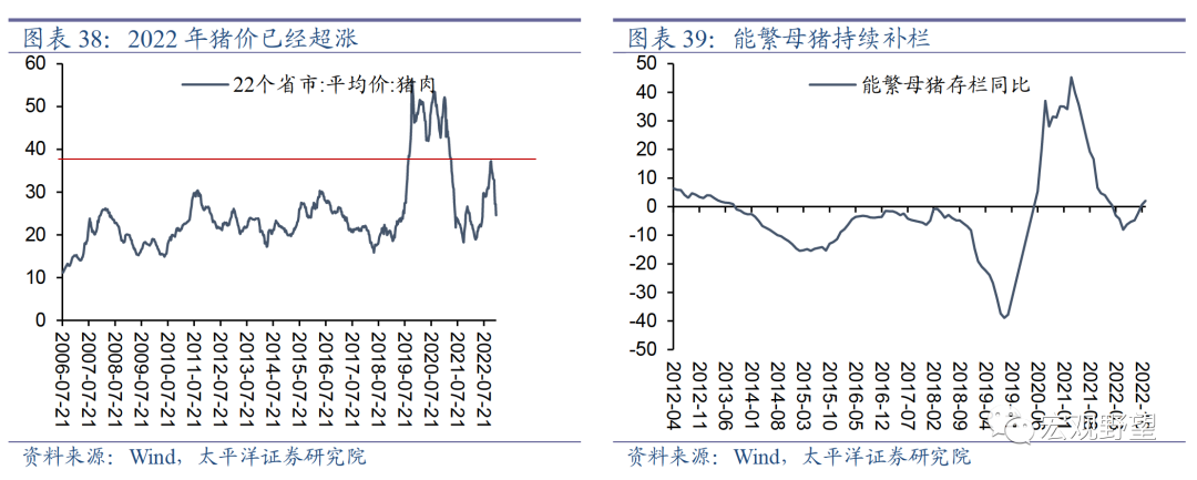 3.2. 全面性通胀的压力不大2023年在全球经济下行甚至衰退的背景之下,工业品价格易跌难涨,中国PPI压力不大。但在国内经济复苏的背景下,CPI有一定上行压力。部分行业比如消费服务相关的价格存在上涨的压力,不过我们认为全面性通胀的压力不大。首先,2023年猪肉价格可能较弱。2022年4月至10月猪肉价格持续上涨,其高点远远超过了2011年及2016年的正常猪周期中的最高价。而在生猪去库存并不是很充分的情况下,我们认为这一涨幅已经在很大程度上超过了基本面所能支撑的范围。在价格的驱动下,4月份之后能繁母猪就开始了持续且较快的补库存,这意味着未来较长时间内猪周期都面临阶段性下行的压力。图片
