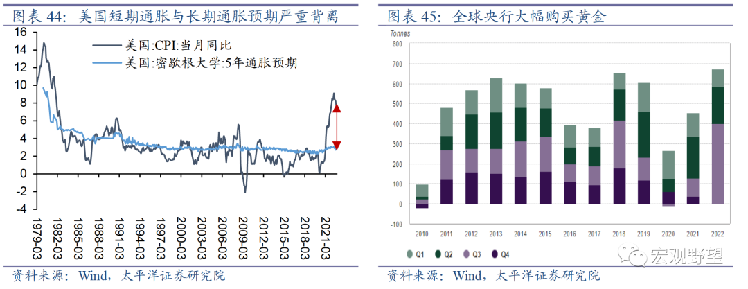 4.3. 贵金属优于工业品我们认为2023年贵金属将迎来较好的行情,黄金具有进攻和防御的双重优势。2022年得益于人民币贬值,人民币计价的黄金上涨较多。但美元计价的黄金没有出现很大幅度的上涨,这与很多人关于黄金“抗通胀”的印象不符。为什么在2022年美国大通胀的环境下,美元计价的黄金没有大涨?我们认为这主要是因为美国通胀结构上出现了较为罕见的短期通胀与长期通胀预期的严重背离。以CPI代表的短期通胀急速飙升,而市场对于通胀的长期预期则一直较为稳定。黄金与通胀的正相关性更多体现为与长期通胀预期的正相关性,所以较低的长期通胀预期对于黄金的推动力有限。而短期通胀的上升却引发了美联储政策迅速转鹰,对黄金价格产生压制。这是2022年美元计价的黄金没有体现出“抗通胀”属性的根本原因。但2023年形势将发生转变。从短期来看,美联储加息周期已经接近尾声,一旦美联储停止加息,则对于黄金价格最大的压制力量将消除。而全球经济下行甚至衰退的压力将推动金价上涨。从长期来看,去美元化已经成为新的长期趋势。在俄乌冲突爆发、美国冻结了俄罗斯的外汇储备之后,各国对于金融安全的重视程度大大上升,2022年前三个季度全球央行购买黄金的总量已经超过了以往年份全年的总和。央行购买黄金实际上明确反映出了对于美元的不信任。2022年在美联储强势加息的支撑下,美元信用没有出现很大压力。但随着美联储加息周期结束,则全球去美元的进程将对美元产生巨大打击。而当信用货币体系受到较大冲击之时,黄金都会成为最后的“硬通货”。我们认为黄金有望进入长期的上涨周期之中。