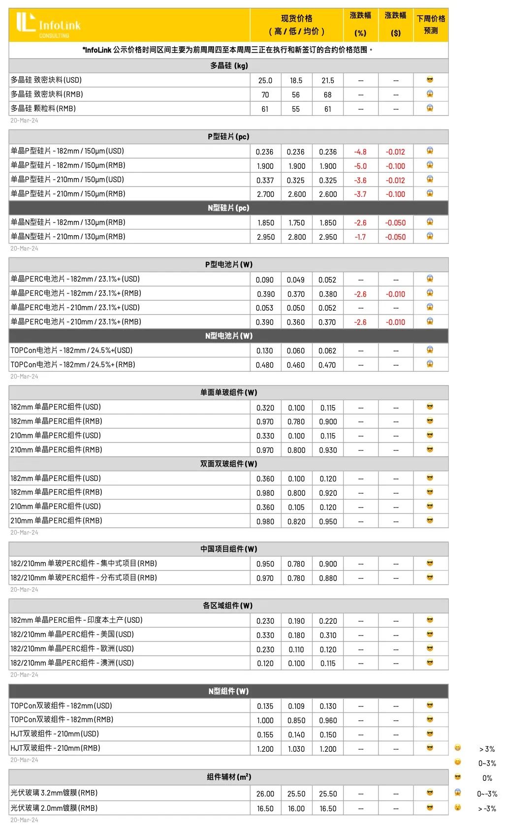 当前电池端维持稳定的生产节奏,厂家库存水平普遍落在一周以内,与硅片端形成鲜明对比。同时,由于LECO技术的导入,厂家在生产TOPCon电池片的入库效率有了显著的提升,平均入库效率达到24.7%及以上,InfoLink将在四月份调整TOPCon电池公示效率。