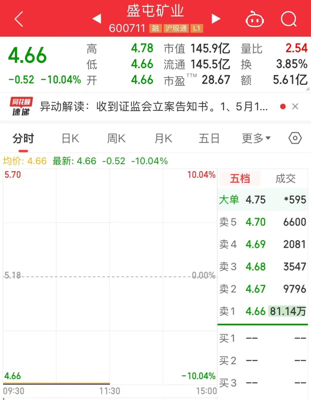 然而在早盘金属概念股纷纷大涨的背景下,盛屯矿业一字跌停。截至上午收盘,盛屯矿业股价为4.66元/股,总市值146亿元,卖一席位封单超81万手。