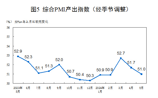5月份,综合PMI产出指数为51.0%,比上月下降0.7个百分点,继续高于临界点,表明我国企业生产经营活动总体保持恢复发展态势。
