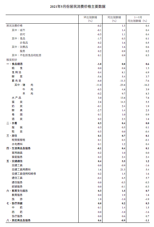 2021年5月份,全国居民消费价格同比上涨1.3%。其中,城市上涨1.4%,农村上涨1.1%;食品价格上涨0.3%,非食品价格上涨1.6%;消费品价格上涨1.6%,服务价格上涨0.9%。1­­—5月平均,全国居民消费价格比去年同期上涨0.4%。