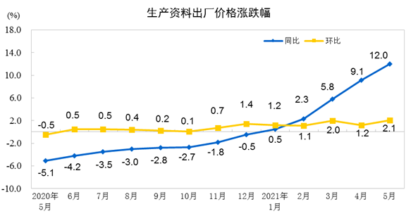 中国5月全国工业生产者出厂价格(PPI)同比上涨9%,涨幅为2008年以来最高,超过前值上涨6.8%;环比上涨1.6%。工业生产者购进价格同比上涨12.5%,环比上涨1.9%。1—5月平均,工业生产者出厂价格比去年同期上涨4.4%,工业生产者购进价格上涨5.9%。