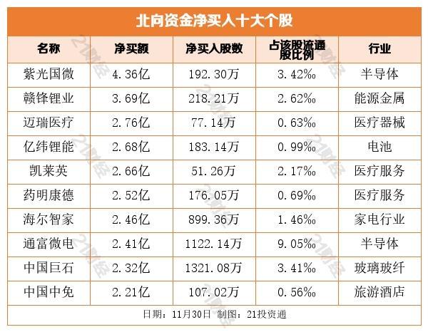 据21投资通(微信号ID:touzit21)智能监测,11月30日,北向资金净卖出34.11亿元,其中沪股通净卖出21.85亿元,深股通净卖出12.25亿元。