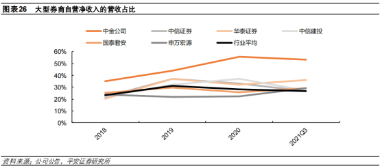 大型券商自营业务收入占比提升,高于行业。主要系自营规模增长。具体来看:一方面,券商根据市场行情阶段性调整自营方向性投资规模;另一方面,客户场外衍生品业务需求增长带来相应的对冲持仓规模大幅增加。