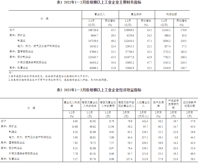 1—2月份,规模以上工业企业实现营业收入16.87万亿元,同比增长45.5%;发生营业成本13.99万亿元,增长43.5%;营业收入利润率为6.60%,同比提高3.15个百分点。