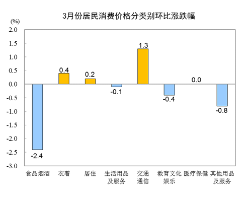 3月份,全国居民消费价格环比下降0.5%。其中,城市下降0.5%,农村下降0.6%;食品价格下降3.6%,非食品价格上涨0.2%;消费品价格下降0.8%,服务价格下降0.1%。