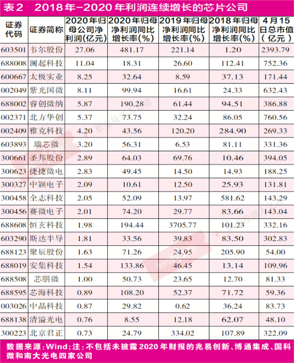 此外,盛陵海表示,部分非龙头的利基公司也具有确定性。如格科微,虽然CMOS市场的份额要少于韦尔股份,但是由于其产品比较“扎实”,它的路是别人无法复制的,所以也比较有竞争优势。再如全志科技、瑞芯微、圣邦股份等,虽然营收规模并不大,市场也有一定的局限,但在竞争激烈的半导体市场“存活”多年,并且每年都可以增长一点,这也说明了它们的韧性很足(见表2)。