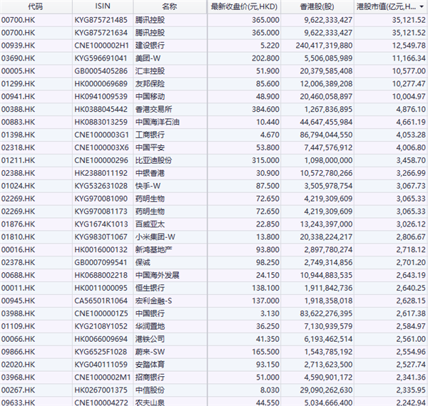 根据港股个股市值排名,腾讯以3.5万亿港元市值位居榜首,排名靠前的美团-W(03690.HK)和快手-W(01024.HK)分别为1.16万亿和3266.99亿。
