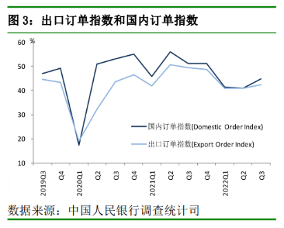 调查显示,三季度出口订单指数为42.2%,比上季度上升1.2个百分点,比上年同期下降7.2个百分点。其中,15.8%的企业家认为本季出口订单比上季“增加”,52.8%的企业家认为“持平”。国内订单指数为 44.8%,比上季上升3.8个百分点。其中,17.3%的企业家认为本季国内订单比上季“增加”,55.0%的企业家认为“持平”。