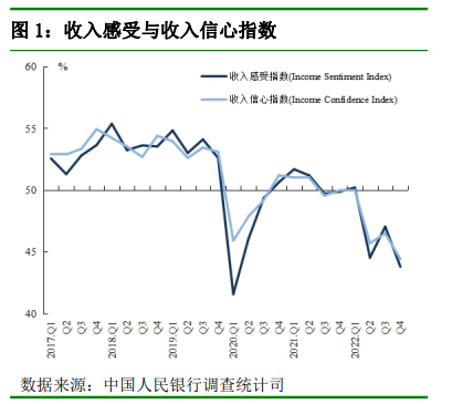 根据央行上述城镇储户问卷调查报告,本季收入感受指数为43.8%,比上季下降3.2个百分点。其中,10.8%的居民认为收入“增加”,比上季减少1.3个百分点,65.9%的居民认为收入“基本不变”,比上季减少3.8个百分点,23.3%的居民认为收入“减少”,比上季增加5.2个百分点。收入信心指数为44.4%,比上季下降2.1个百分点。