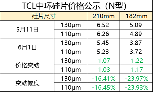 6月1日,TCL中环在官微平台发布了单晶硅片最新价格。与5月11日报价相比,不同尺寸硅片价格均有大幅下降。其中,p型硅片价格降幅16.35-24.00%,n型硅片价格降幅16,41-23.97%。具体如下: