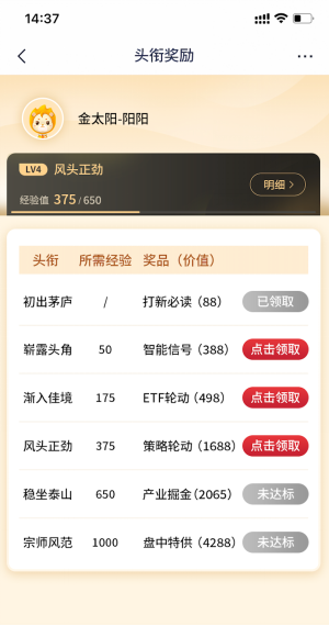 投资者还可以参加ETF答题、ETF加自选、ETF猜涨跌、晒账单等活动,获取经验值并升级头衔,从“初出茅庐”升级成为“宗师风范”,头衔升级同步获得相应的付费工具及资讯奖励,最高可获得价值4288元的盘中特供VIP资讯礼包!
