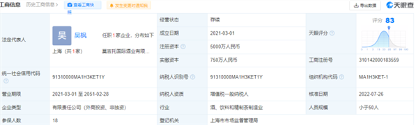 天眼查显示,莫吉托国际酒业有限公司,成立于2021年3月,位于上海市,是一家以从事酒、饮料和精制茶制造业为主的企业。法人代表是公司董事长吴枫,企业注册资本5000万人民币。人员规模小于50人,参保人数18。