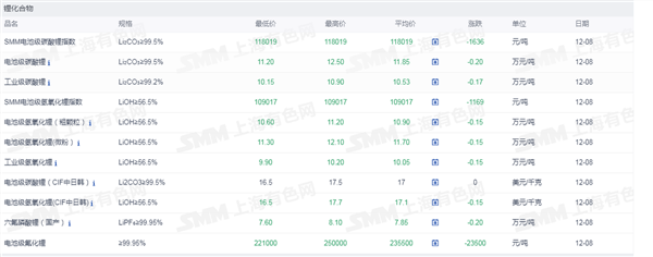 证券之星新能源车行业周报:据上海有色网,截止12月8日,电池级碳酸锂11.2-12.5万元/吨,均价11.85万元/吨,环比上一工作日下滑0.2万元/吨;工业级碳酸锂10.15-10.9万元/吨,均价10.53万元/吨,环比上一工作日下滑0.17万元/吨。12月8日市场中锂盐企业的出货情绪抬升,个别锂盐企业和正极材料以11.2万元/吨价格成交较多的电池级碳酸锂,而盐湖企业和回收锂盐企业观望情绪抬升,并无明显出货打算。近期正极材料企业询价和拿货意愿更为积极,但由于贸易企业盘面套保难以平仓而限制其销售碳酸锂现货,正极材料更多偏向于向锂盐企业采购。但目前正极材料企业反馈其订单无明显增量迹象,其在进行采购并补充碳酸锂原料库存后,对于碳酸锂的采购或也难有持续大幅放量的情况出现。