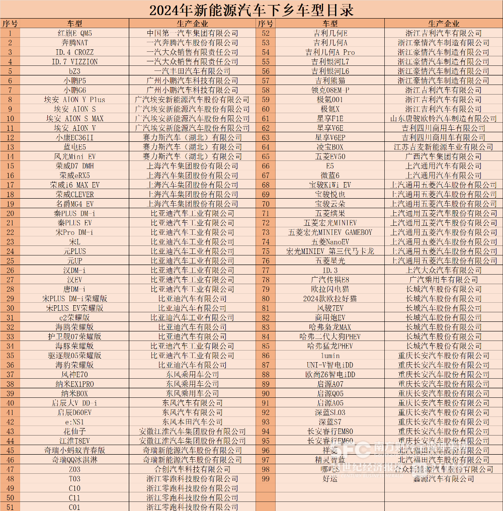 5月15日,工业和信息化部官网发布消息,工业和信息化部、国家发展改革委、农业农村部、商务部、国家能源局联合组织开展2024年新能源汽车下乡活动,并公布新能源汽车下乡活动车型目录,包括99款车型,较上一年活动增加30款。