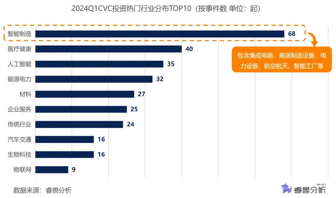 2024Q1,中国CVC投资事件主要分布在智能制造、医疗健康、人工智能、能源电力等26个行业。智能制造以68起融资事件位列第一,医疗健康、人工智能和能源电力领域同样获得CVC机构较高的关注度,分别有40、35和32起投资事件。