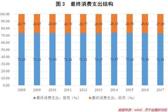 进一步分析,考虑到最终消费支出包括政府消费支出与居民消费支出两部分,故仅凭上述论证就定论稍显片面。我们可以将最终消费支出加以解构。可以看到,2008年至2017年,我国居民最终消费支出占全部消费的比重始终在73%左右,虽然2017年略有下降,为72.91%,但比重的绝对数值仍然极高(参见图3)。这就意味着我国居民消费动力仍然强劲。
