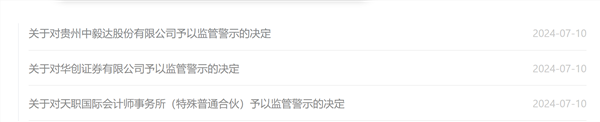 7月10日,上交所官网披露3张警示函。由于在中毅达重大资产重组事项中存在多项违规行为,中毅达、华创证券、天职国际会计师事务所(特殊普通合伙)(以下简称“天职所”)被予以监管警示。