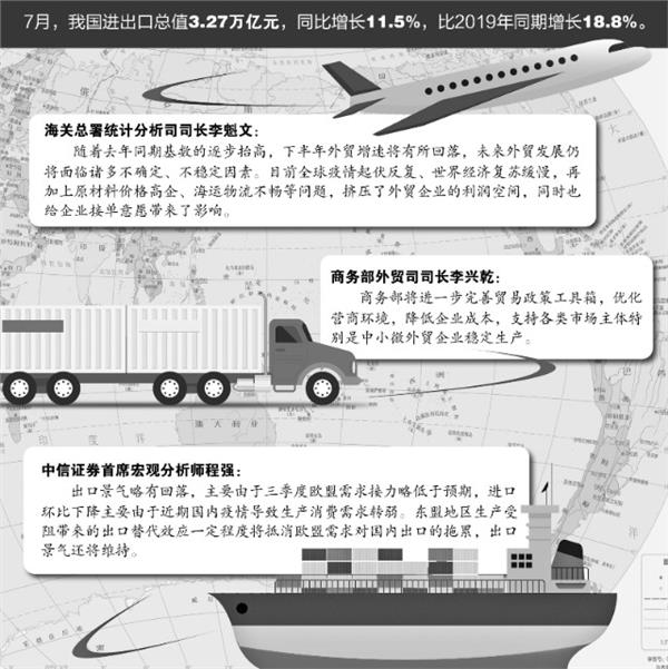 海关总署8月7日发布数据显示,7月当月,我国进出口总值3.27万亿元,同比增长11.5%,比2019年同期增长18.8%。海关总署统计分析司司长李魁文表示,7月份,我国外贸继续保持良好发展态势,进出口总值连续第14个月实现同比正增长。