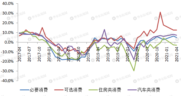 商品消费复苏大幅不及预期,整体增速较上月略有放缓。与投资相悖的是,消费中住房类消费是最大的拖累项,而且它还是基于19年较低的基数之上,包括家电、家具分项修复均较为缓慢。必要消费包括食品、衣着、医疗等增速已经回到疫情前水平。可选消费和汽车类消费是主要动力,尤其是可选消费中的通讯器材、化妆品增速相当显著。