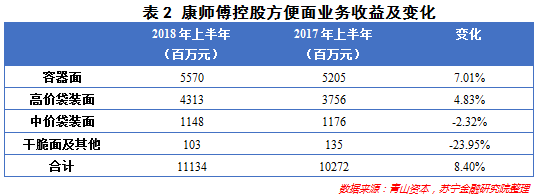 再来看方便面。一直以来,康师傅控股的业绩主要依赖方便面与饮品业务。根据其公司财报显示,2018年上半年,方便面业务占康师傅控股总营收的36%,方便面及饮品业务收益分别增长8.4%及9.19%。与此同时,方便食品、其他业务同比下滑3.2%、9.03%。而方便面业务的整体增长,归根结底要得益于容器面与高价袋面销售的拉动(参见表2)。这在某种程度上说明,康师傅方便面业务的营收和净利润见底回升,源自于过去几年全面升级方便面品类。而老百姓的买账,也证明了所谓的便宜货受欢迎,实际上却是另一种“升级”的体现。
