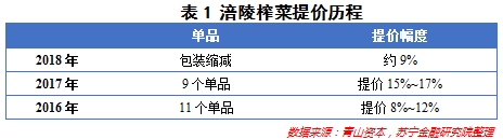 先来看备受瞩目的涪陵榨菜。早在2016年,涪陵榨菜就曾宣布对主力产品进行涨价,2017年更是一口气将9个单品提价15%~17%,到了2018年,涪陵榨菜索性以缩减包装的形式,变相提价9%(参见表1)。不过,由于榨菜产品集中度高、异质性强,定价能力也不弱,近年来,作为龙头企业的涪陵榨菜,对产品的提价并未给销量带来影响。这或许从侧面反映出居民的消费仍在升级。
